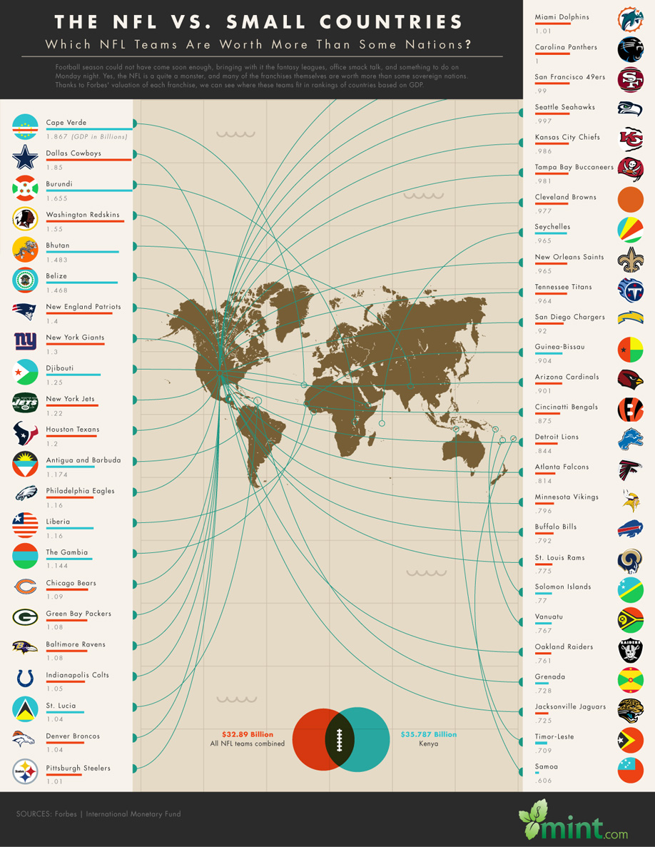 This infographic takes that even a step further and compares sovereign nations to the monetary value of NFL teams. I think we can all join together and agree that perhaps it’s time to start discussing sending foreign aide to Jacksonville to help them out of poverty.