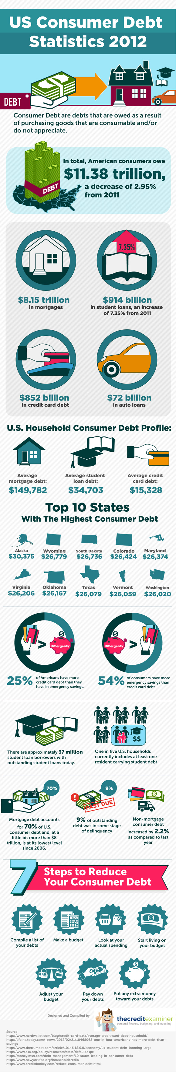 While overall US consumer debt was down in 2012, the number is still staggering at 11 trillion dollars, with one of the largest being student loans, which is now higher than US consumer credit card debt. The below infographic breaks down some of the surprising and interesting statistics surrounding people’s spending habits and debt.