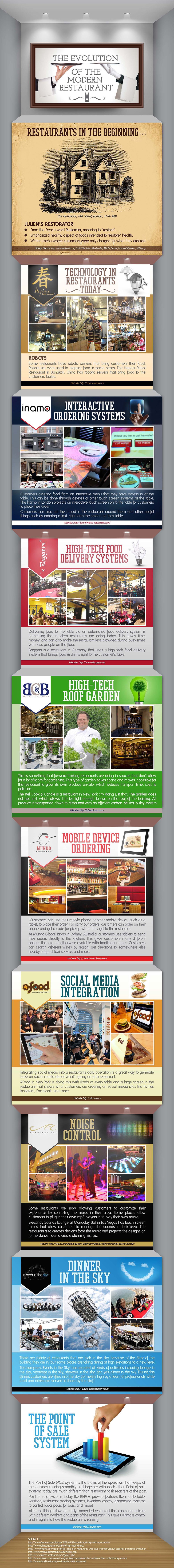 As technology has advanced so has the industries it supports. Restaurants are no exception, as modern technology has drastically changed how the food service functions. From updated POS systems, modern ordering logistics software and even food production, the modern restaurant has adopted many futuristic technologies. The infographic below details out a lot of these fun advancements.