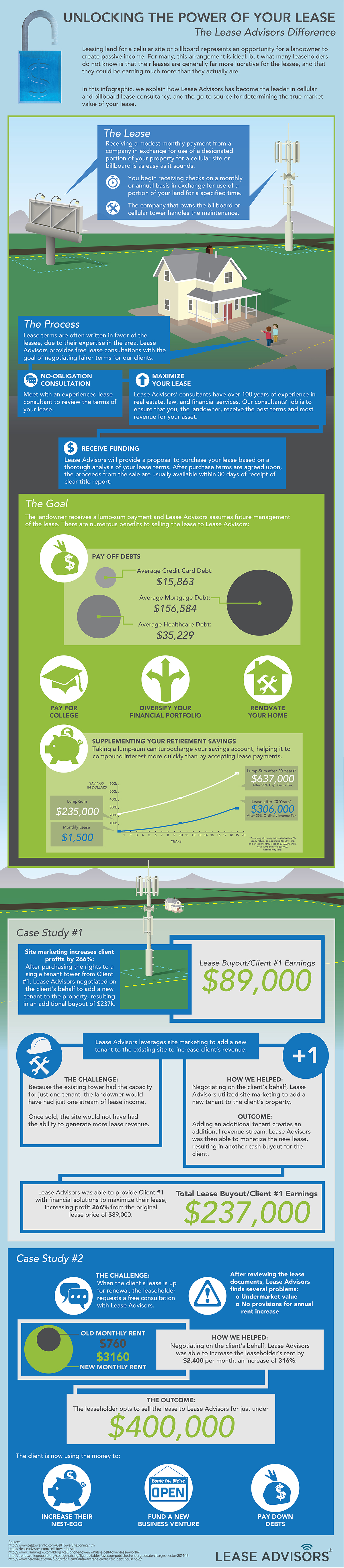 Own a lot of land? Looking for some revenue options? The below infographic details out some advice when it comes to leasing land to cell phone and billboard towers. These leases can be complicated so the below infographic is helpful for those unsure where to turn.