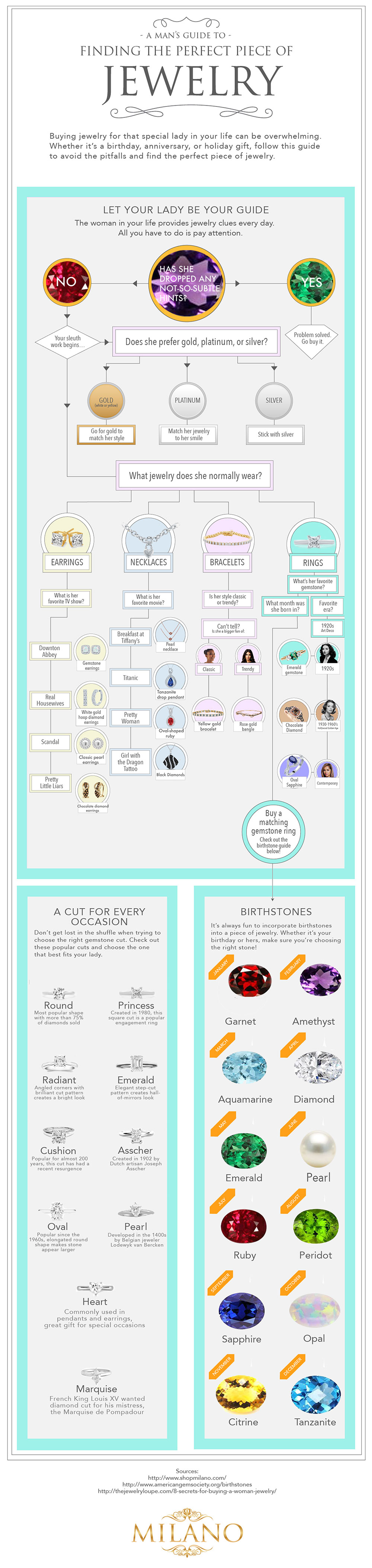 Buying jewelry can be an extremely complicated process, especially if your interest are elsewhere, such as Football or drinking beer. Never fear gentlemen, the below infographic details out everything you need to know about buying jewelry for that special someone. Now you won’t have to worry about looking foolish when making the big purchase. Check it out below: