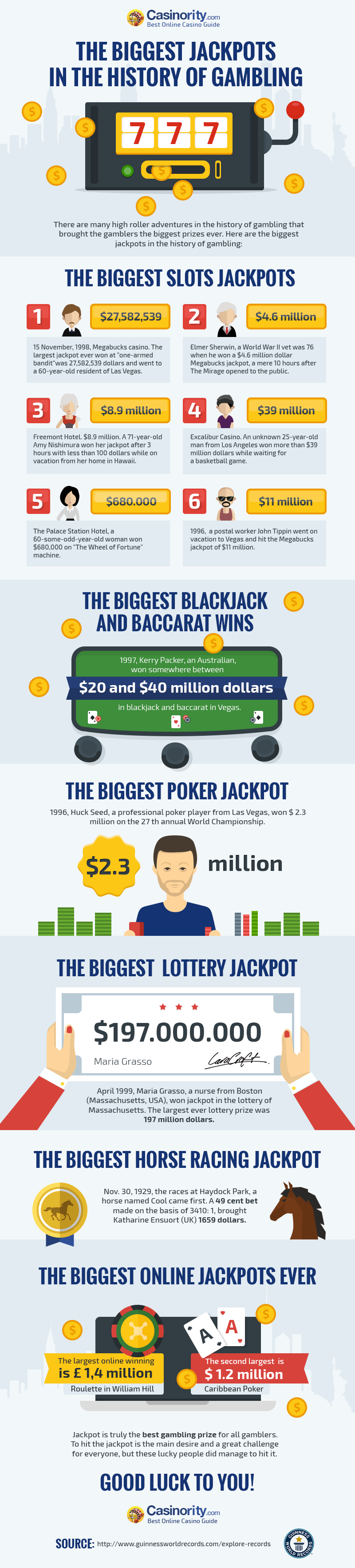 Ever wondered what the biggest wins in gambling history were? The below infographic features the biggest wins in gambling history. From slots to blackjack, every game has a biggest winner listed and the numbers will certainly make your jaw drop.