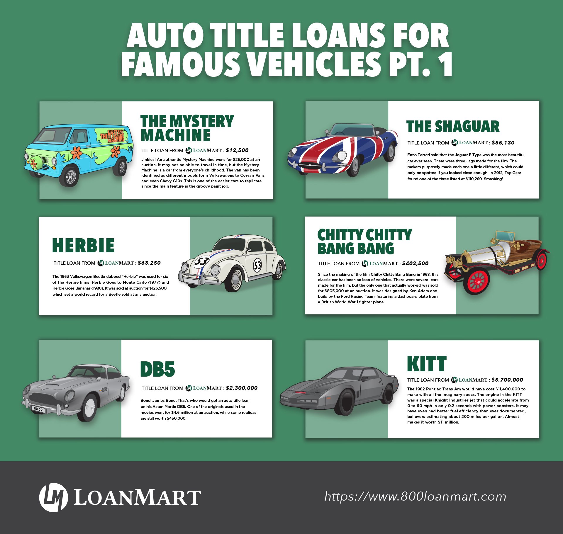 Want to replicate one of your favorite famous vehicles? The below infographic details out the auto loan price for some famous cars like The Mystery Machine and Herbie, check it out below!