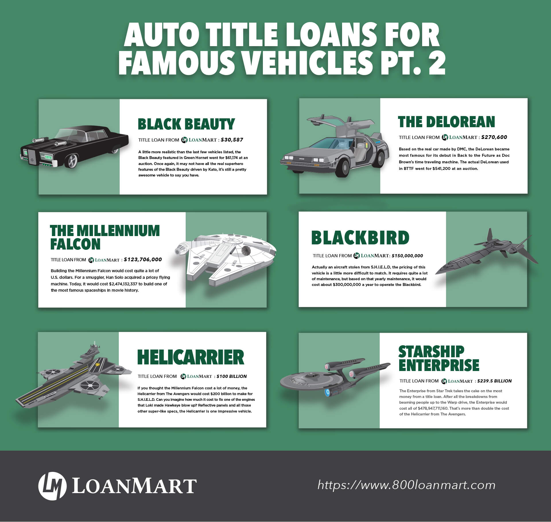 Below you’ll find part two of the auto title loans for famous vehicles, this time including cars like Black Beauty and The Millennium Falcon. Who wouldn’t want their own Han Solo-owned spaceship?