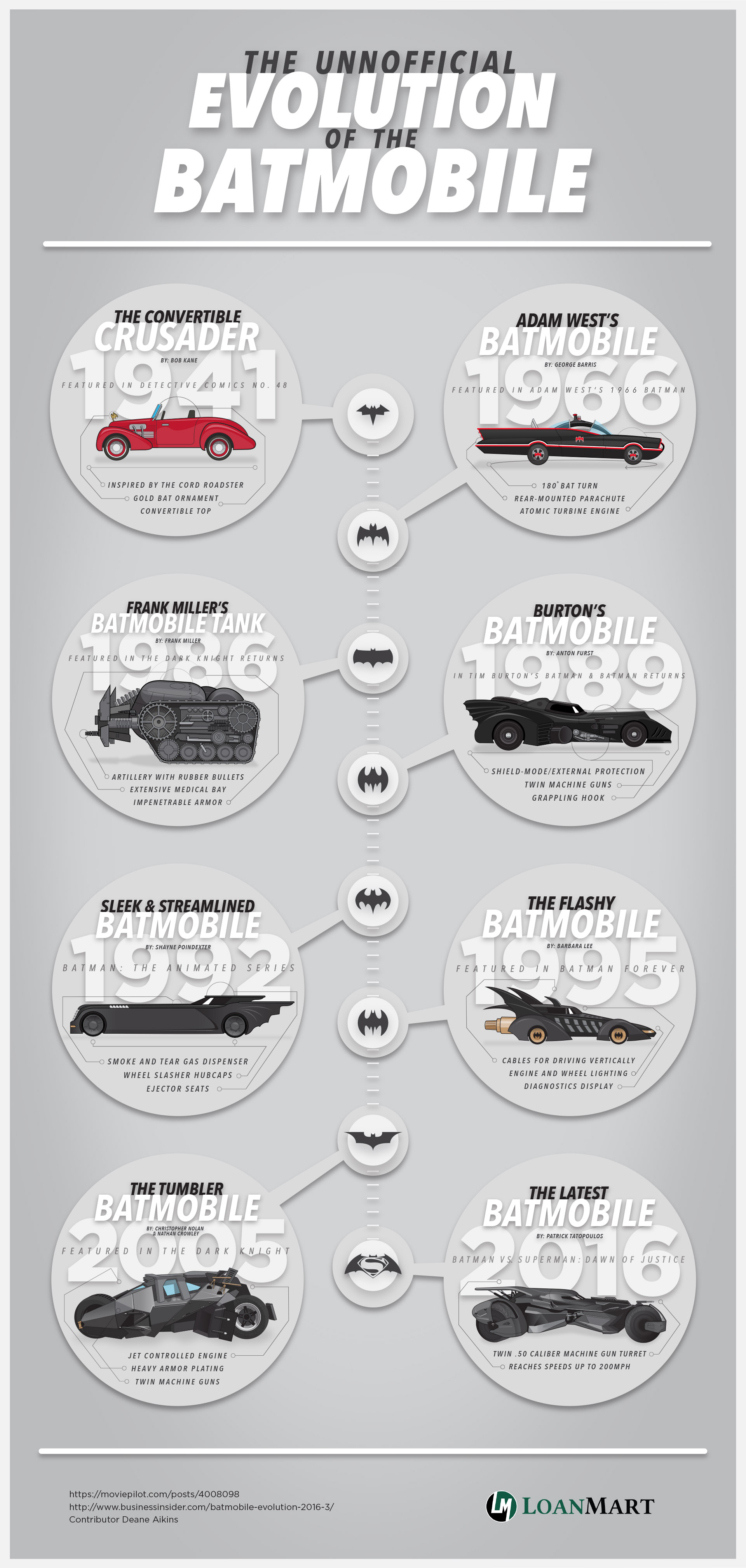 Interested in learning more about the evolution of Batman’s Batmobile? The below infographic details out the history of one of the world’s most famous vehicles, check it out!