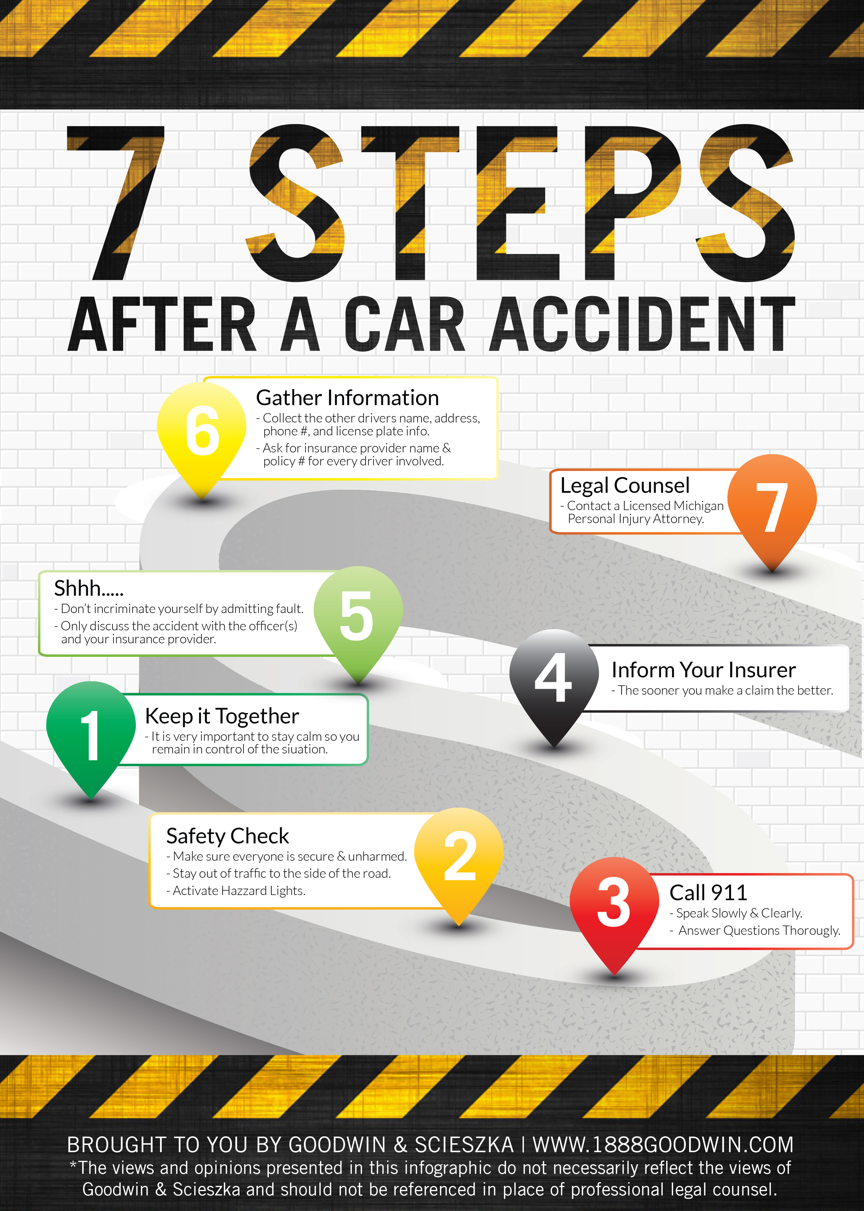 Below you will find a helpful guide on how to protect yourself after a car accident. The infographic presents seven steps to take following a car accident to make sure you don’t miss any important details. Check it out!