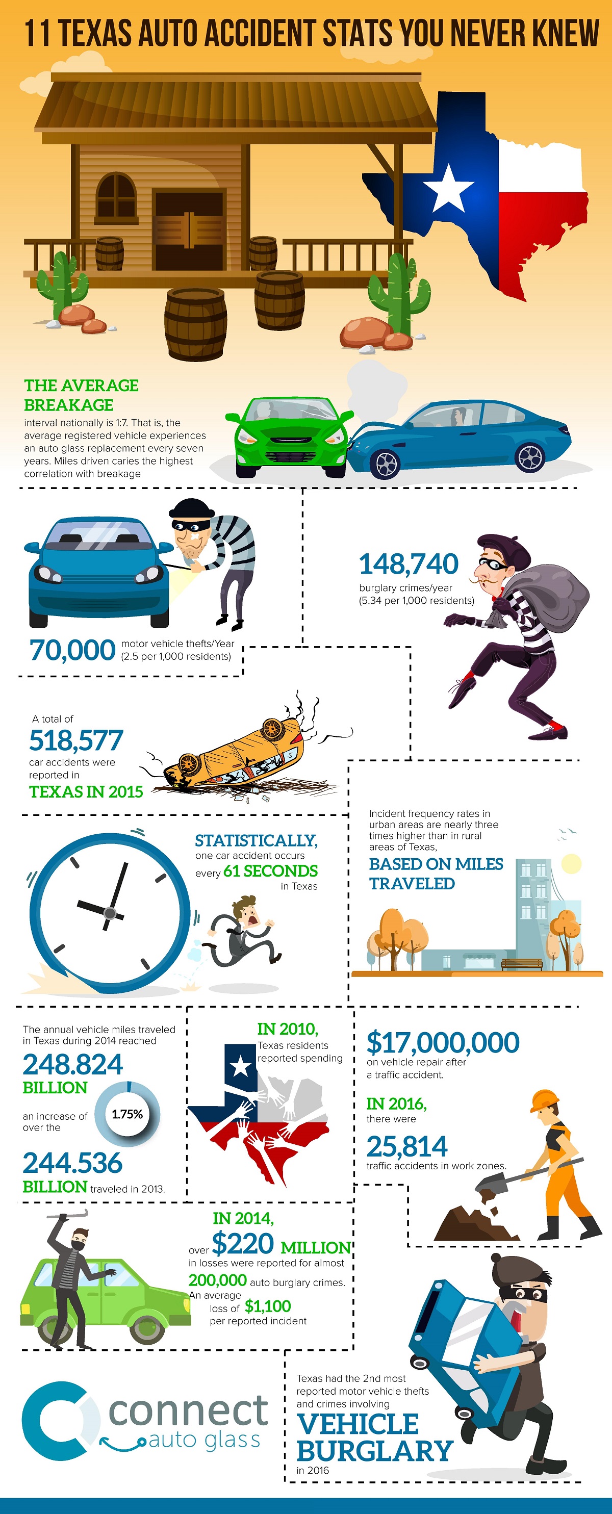 While nobody wishes for a car crash, the below stats are pretty fascinating. Did you know there is a car accident every 61 seconds in Texas? Learn other interesting stats on the infographic below:
