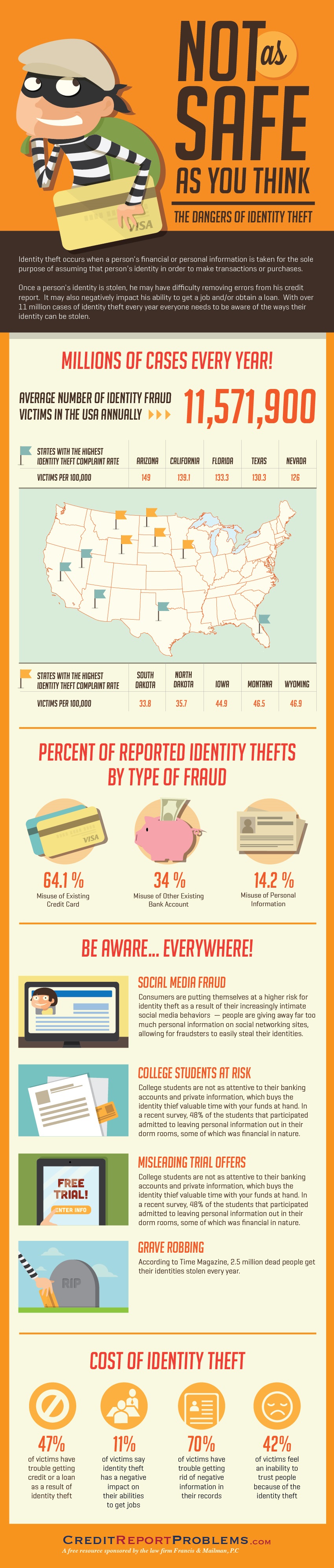 It’s a terrifying thought, and many people are not even sure how to protect themselves. The below infographic details out many details about identity theft as well as some common areas that are targeted most frequently: