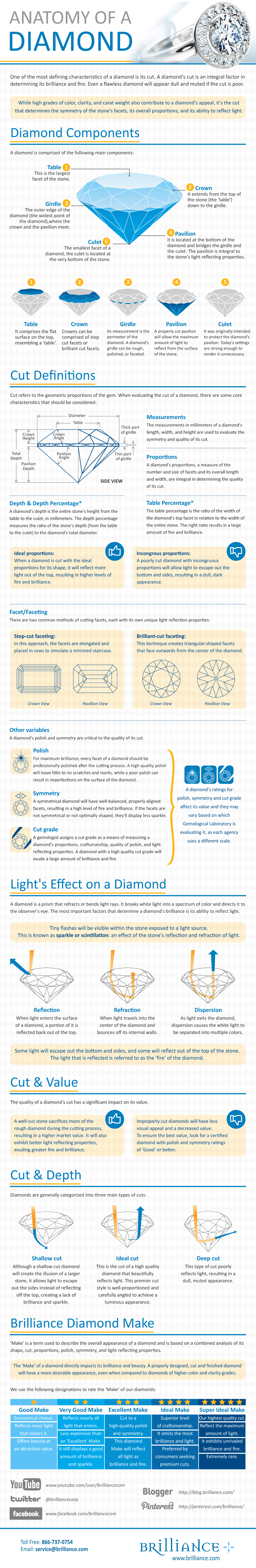 This new infographic from Brilliance gives readers the basics of a diamond’s anatomy in a no-nonsense, highly informative manner. You can learn about the components of a diamond (table, crown, girdle, pavilion, and culet) in-depth, and educate yourself on how to evaluate the cut of a diamond via helpful diagrams. There are also handy tips and advice interspersed in the infographic which can prove especially helpful for first-time diamond buyers. Brilliance also features a chart on how the company determines the “make” of a diamond.