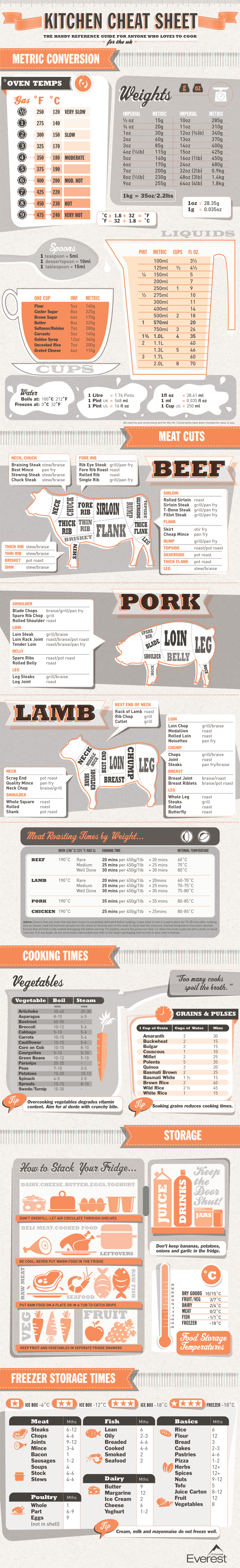 If you love cooking and have been looking for all those useful bits of information in one place then this is a great infographic which has everything you have been looking for. How many times have you had an old recipe and didn’t know how to update the measurements? metric conversions, meat cut charts, meat roasting times, grain and pulse cooking times, food storage temperatures and times. Everything you need in the kitchen.